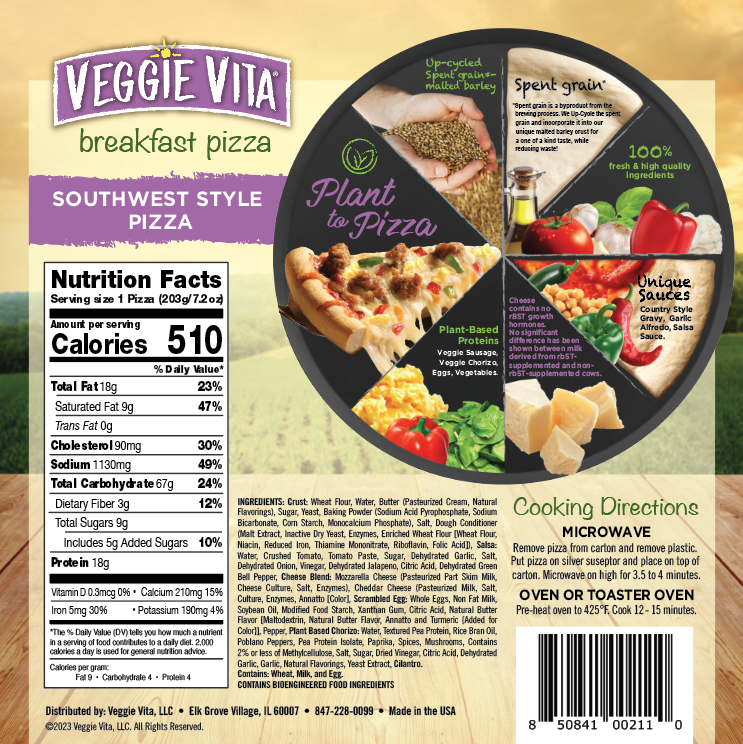 Veggie Chorizo Sausage, Scrambled Eggs, Mozzarella Cheese, Cheddar Cheese and Salsa Sauce and our Biscuit Style Crust!